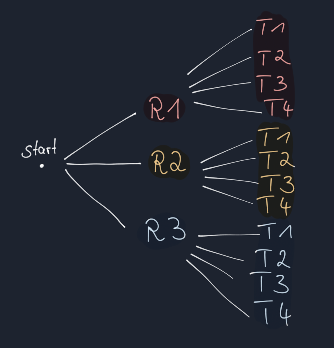 Für sogenannte mehrstufige Zufallsexperimente bietet es sich an, die möglichen Ergebnisse in einem Baumdiagramm zu strukturieren. Dazu wird auf die linke Seite zuerst ein Startpunkt markiert (entweder doch einen Punkt oder das Wort "start"). Danach werden von da aus alle einzelnen Ergebnisse des ersten Experiments aufgelistet und mit dem Startpunkt verbunden. Nun betrachten wird von jedem Ergebnis des ersten Experiments immer eine Verbindung zu allen Ergebnissen des zweiten Experiments gezogen, da man erstmal davon ausgeht, dass nach jedem der ersten Ergebnisse immer jedes der zweiten Ergebnisse auftreten kann